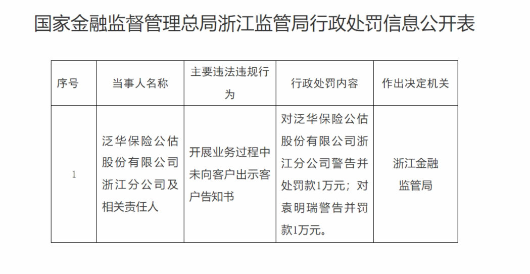 12月22日,国家金融监督管理总局浙江监管局行政处罚信息公开表显示,泛华保险公估股份有限公司浙江分公司,开展业务过程中未向客户出示客户告知书,被警告并处罚款1万元;相关责任人袁明瑞被警告并罚款1万元。