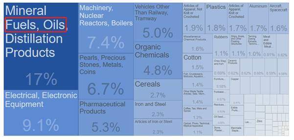 排除欧盟这个联合体的话,印度的GDP总额位居全球第五,仅次于日本,经济体量较大。出口方面,矿物燃料,也就是石油,出口量占比高达17%,位居第一位。印度本身石油产量并不高,为何能够出口大量石油?答案就是美国制裁印度的原因:印度购买俄罗斯的低价石油,然后转手在国际市场售卖,从中赚取差价。